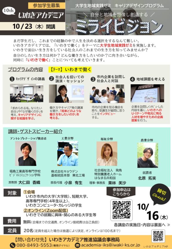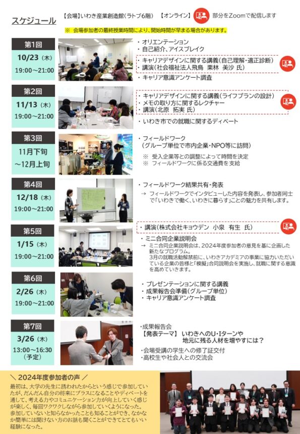 令和7年度は昨年度に引き続き、「いわきで働く」をテーマに、実社会での経験による課題解決力の向上や明確な目的意識・責任感を養うことを目指し、自身のキャリアデザインを考えることで自身の強みや弱みなどを見つめることにより自己理解を深めるとともに、学校・学部・学年の異なる学生や地域の社会人という他者とコミュニケーションを重ねることにより社会人としての人間力を磨いていきます。